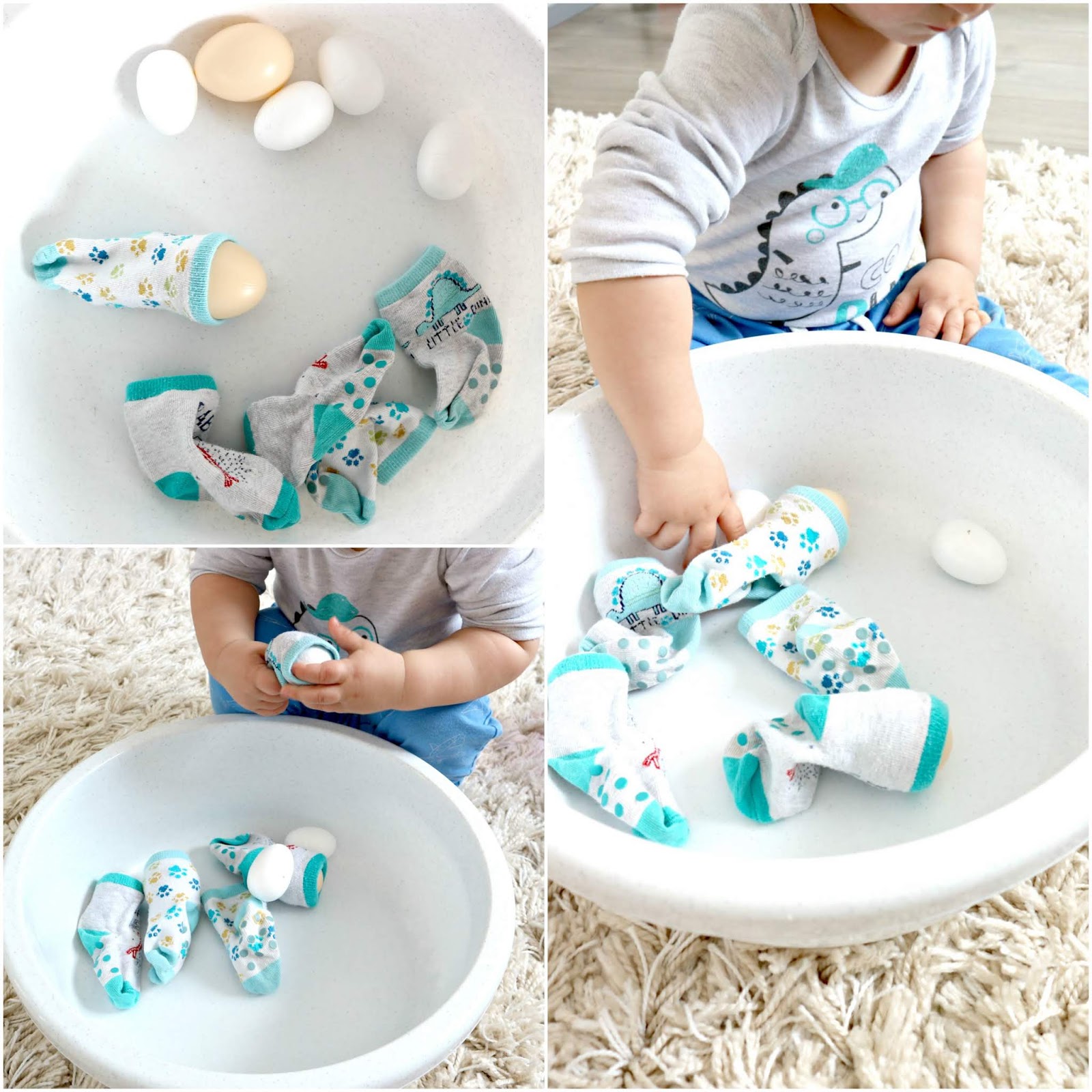 This sounds a bit silly, but it was quite fun for my toddler and it helped him practice some fine motor skills. Get some baby socks, play eggs and a bin/basket/bowl. I put each egg into a sock and then handed my toddler the basket full of those. I showed him how to take out an egg myself and then he kept trying on his own. Once he figured it out he was so proud of himself and he really enjoyed this.